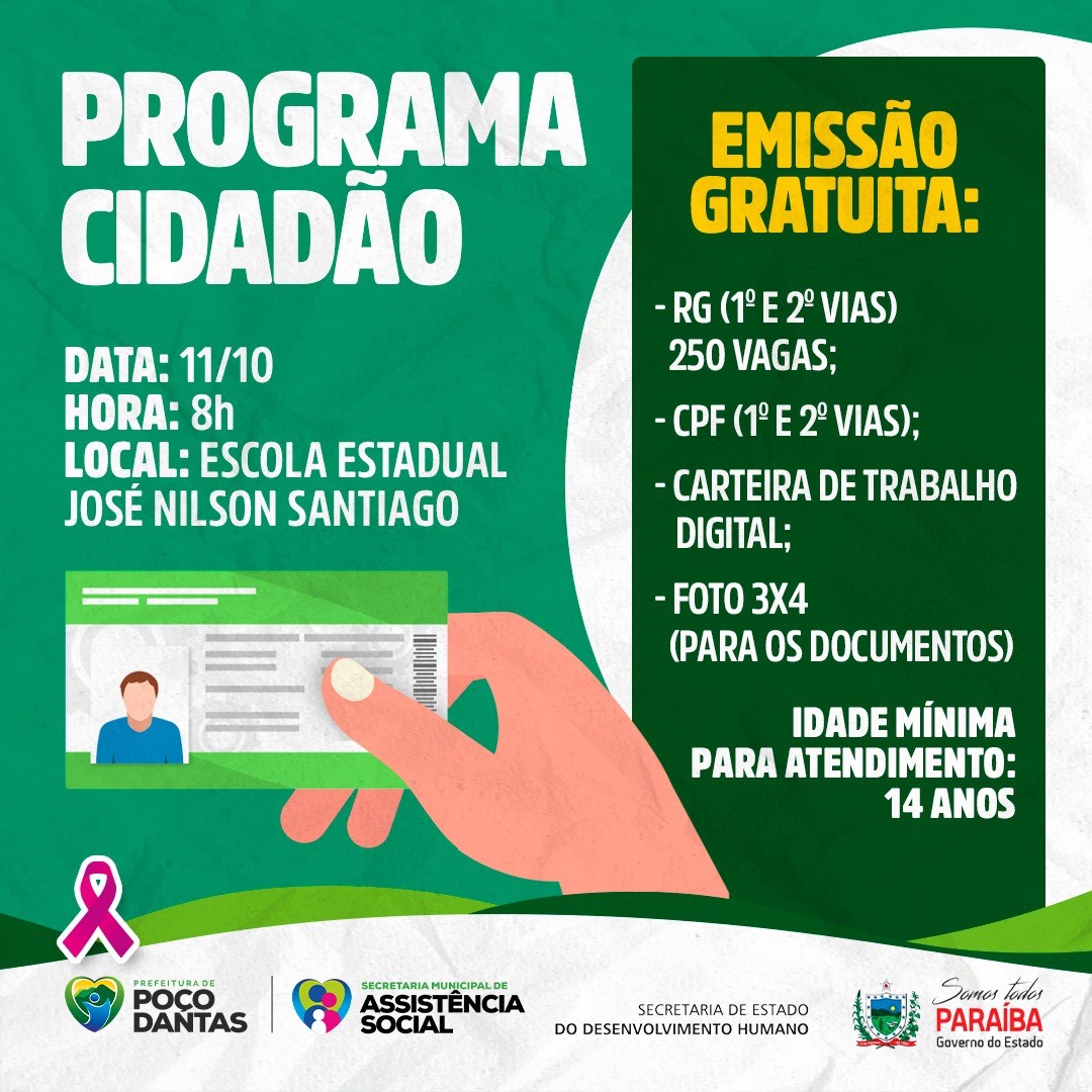 O município de Poço Dantas vai receber no próximo dia 11 de outubro, o Programa Cidadão, do Governo do Estado, para emissão de RG (1ª e 2ª via), CPF (1ª via), carteira de trabalho digital e foto 3×4. Os serviços ficarão disponíveis das 8h às 18h, na Escola Estadual José Nilson Santiago.