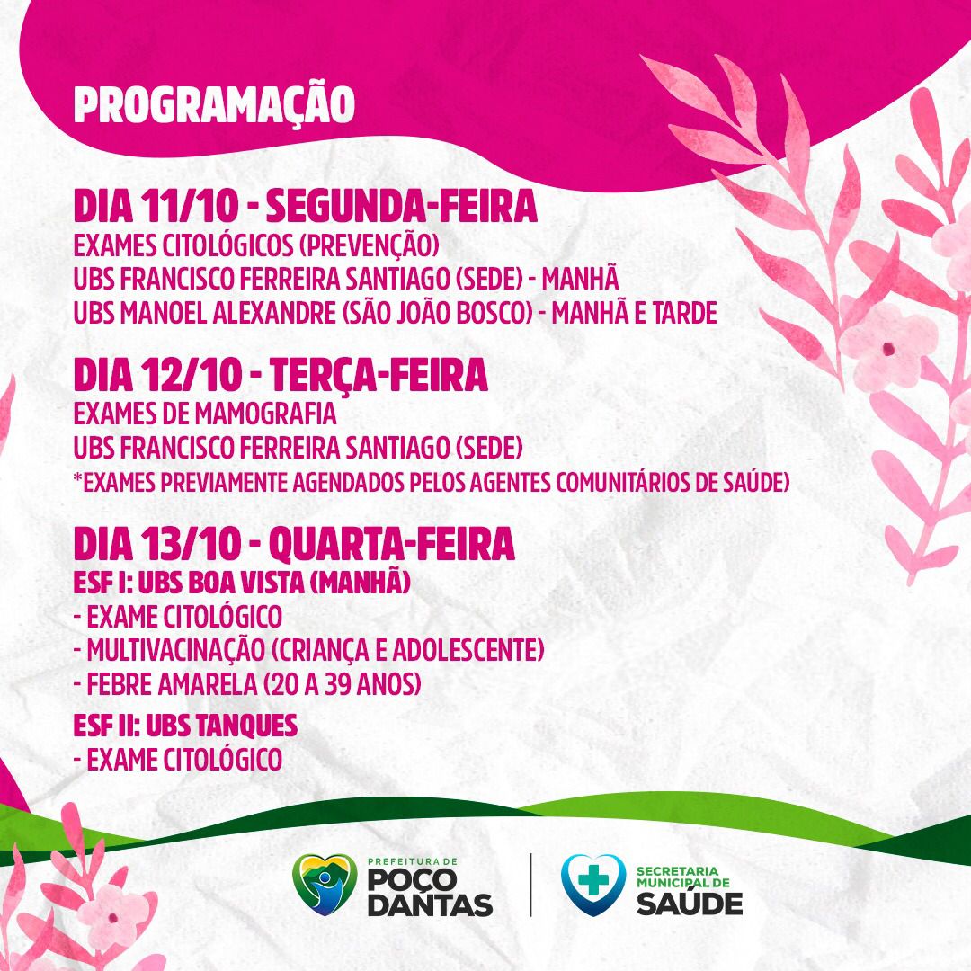 A Prefeitura Municipal de Poço Dantas, através da Secretaria Municipal de Saúde, se prepara para realizar uma vasta programação com serviços de saúde para celebrar o Outubro Rosa, campanha nacional de prevenção e combate ao câncer de mama e de colo do útero.